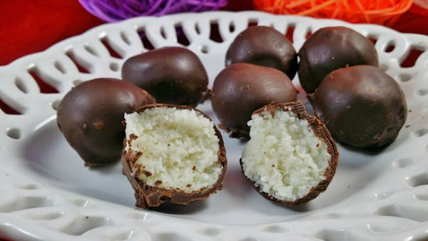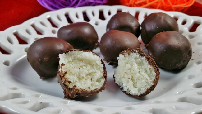 - Dejad caer las bolitas en el chocolate y dadle vueltas con un tenedor para que se empapen completamente. Sacad las bolitas y dejarlas sobre papel de horno. Meted en la nevera. A la media hora, sacad de la nevera y preparad otro baño de chocolate. Dejad enfriar de nuevo en la nevera. Con esto es suficiente, y ya tendréis vueltas cocholitas (bolitas de coco y chocolate).