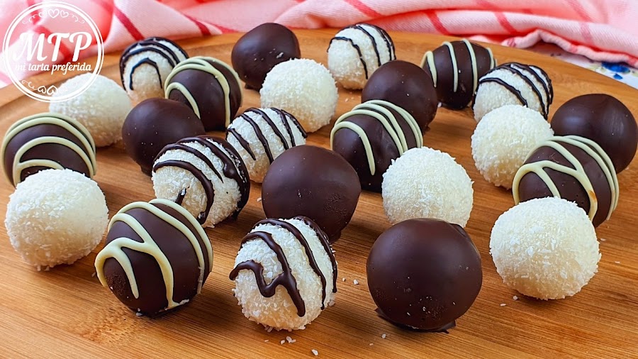 6- Cuando hayamos terminado de bañar las bolitas en chocolate rebozamos en coco rallado la otra mitad de las bolitas, y una vez listas las volvemos a colocar en la bandeja.