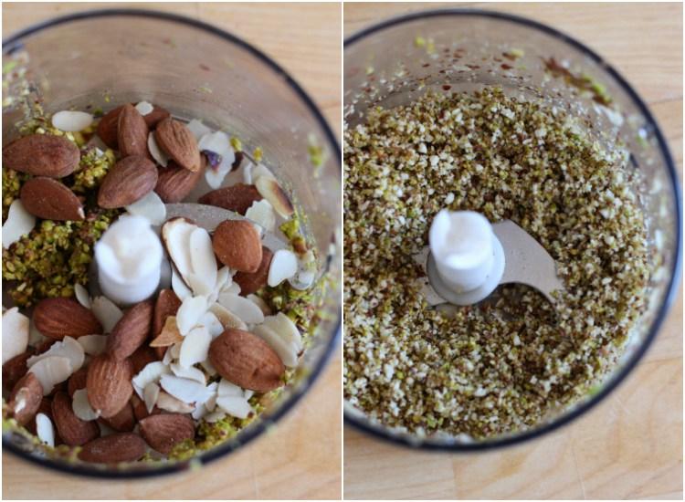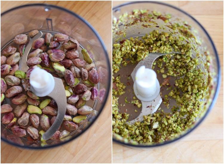Triturar los pistachos pelados en una procesadora hasta obtener pedacitos muy pequeños. Apartar la mitad de los pistachos molidos (luego los utilizaremos para decorar) y el resto lo dejamos dentro de la procesadora.
