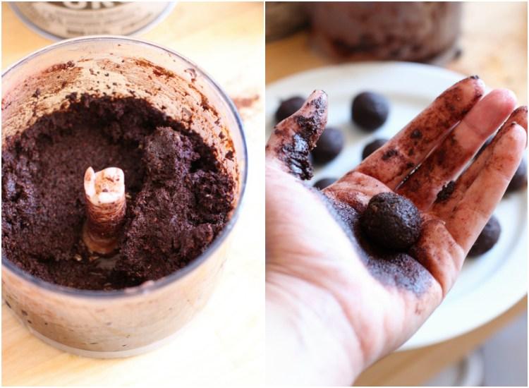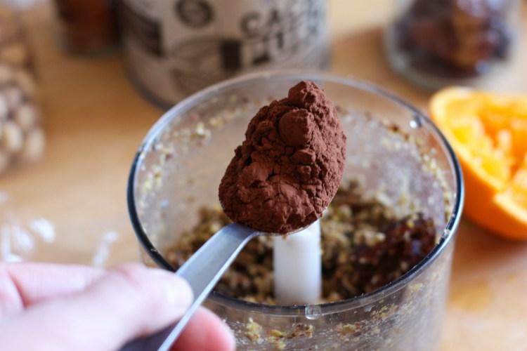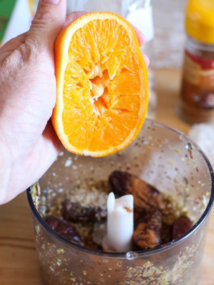 Añadir ⅔ de taza de dátiles sin hueso (revisar tips de abajo), 2 cucharadas colmadas de cacao en polvo, ⅓ de cdta de cardamomo, ½ cdta de canela, 1 cucharada de miel y finalmente el jugo de ½ naranja, su pulpa y una cucharadita de ralladura de la misma. Procesar todo muy bien hasta obtener una pasta moldeable de color chocolate. Si la pasta queda demasiado densa agregar un poquitito de agua (muy poca), si por el contrario queda muy líquida agregar un poco de almendras para lograr mejor consistencia.