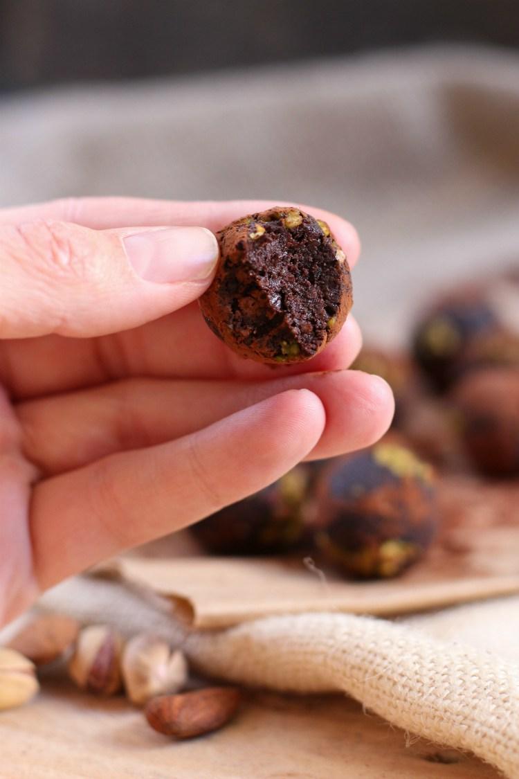 Los dátiles le aportan dulzor y consistencia a las bolitas y el cacao el delicioso sabor chocolatoso. Al contener pistachos (que personalmente me encantan), estas bolitas son menos dulces de lo normal. Si eres más de dulce te recomiendo cambiar los pistachos por nueces o avellanas (también quedan riquísimas!) o simplemente eliminarlos de la receta, eso queda a gusto de cada uno.