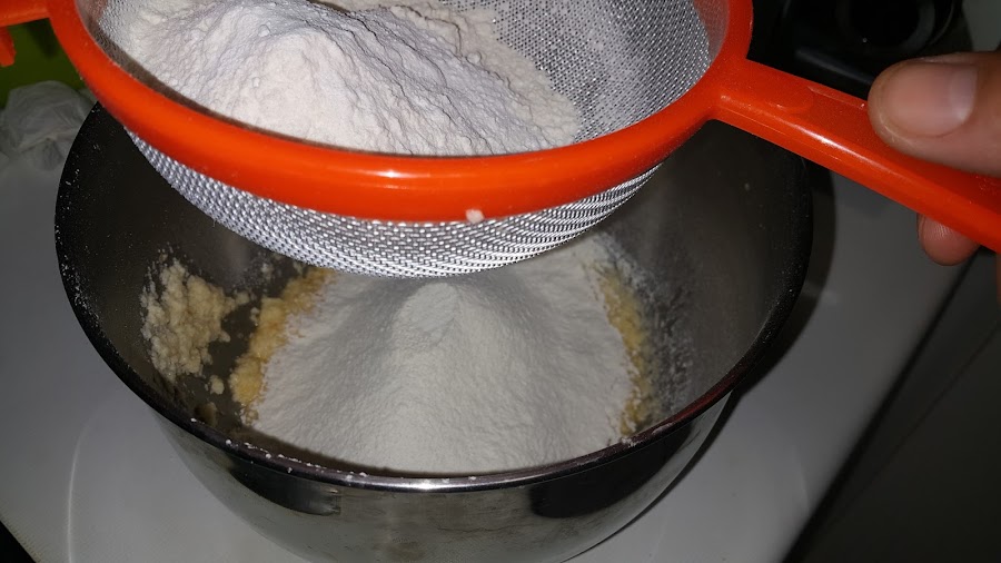 Cuando tengamos los huevos integrados, añadimos la harina con la levadura tamizada en 3 veces y vamos mezclando con una espátula.