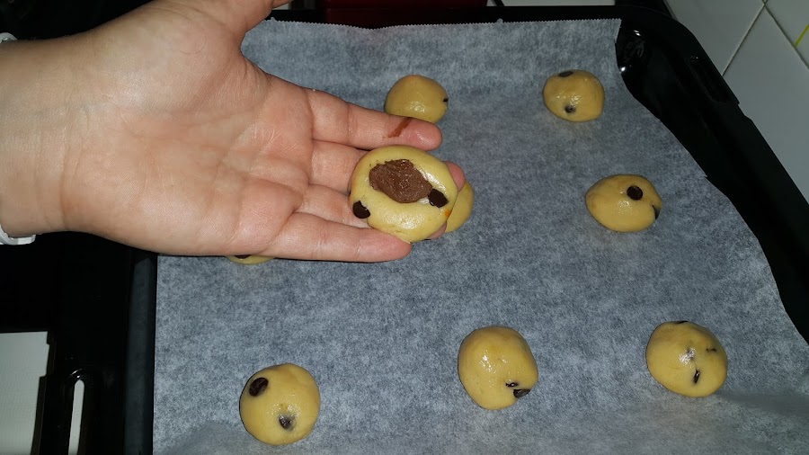 Refrigeramos la masa una media hora y a continuación cogemos pequeñas porciones, las aplanamos y añadimos una cucharadita de crema de cacao. Cerramos la galleta con cuidado.