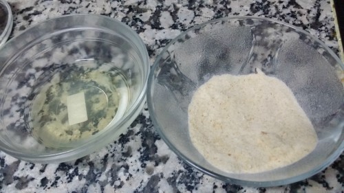 2. - Colocamos tres platos o recipientes: uno con harina, otro con el huevo batido y otro con el pan rallado.