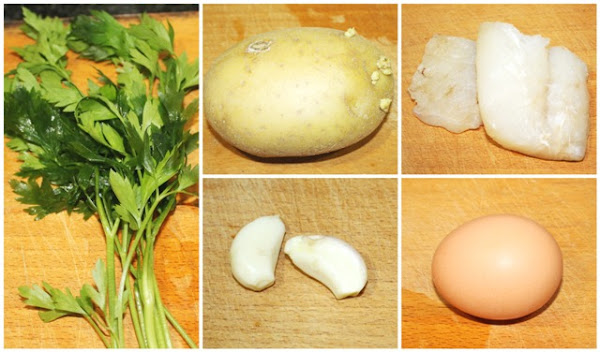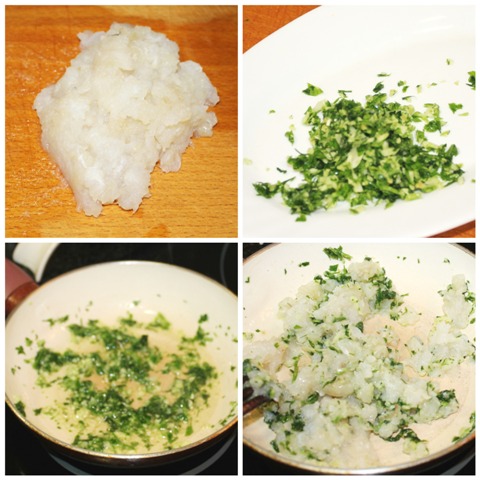 Por otra parte picamos el bacalao muy pequeñito, y el ajo y el perejil. En una sartén con muy poquito aceite y fuego medio, freímos primero el ajo con el perejil un par de minutos y añadiremos el bacalao, hay que tenerlo sólo hasta que el bacalao tome un color blanco.