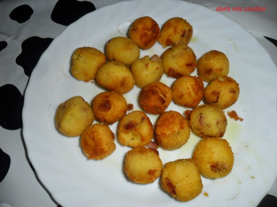 Vamos cogiendo porciones de puré con una cuchara, escondemos en su interior, el relleno de jamón y queso, damos forma de bolitas y rotamos en el pan rallado, huevo batido y pan rallado para que quede una corteza crujiente. Las freímos en abundante aceite de oliva suave por tandas.