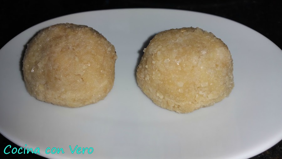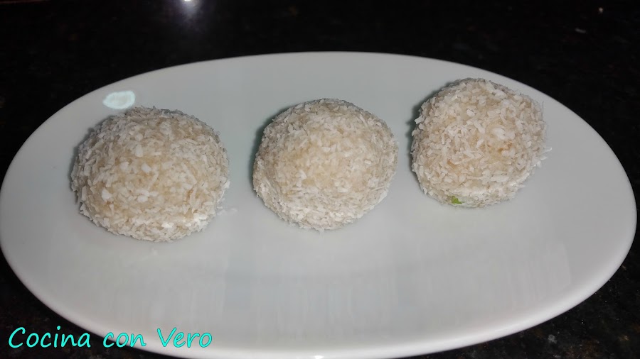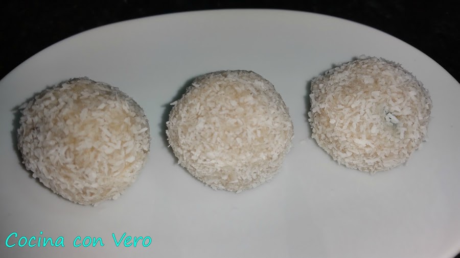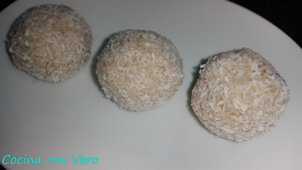 2/ Hacer bolitas redondas pequeñas y pasarlas por el coco rallado o bien por la almendra molida para recubrirlas muy bien. (Yo en éste caso hice de ámbas opciones). Guardarlas en la nevera y consumir.