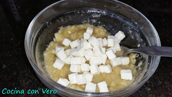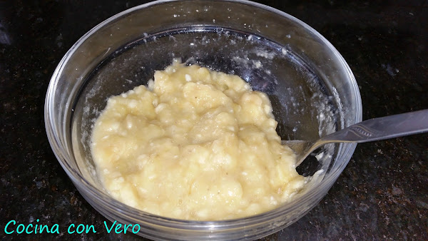 1/ Machacar con el tenedor los plátanos en un cuenco, agregar el coco deshidratado solamente o bien la almendra molida junto el coco deshidratado y mezclar. (Yo hice las dos, los de solo coco deshidratado con la mezcla de plátano y pistachos y por otro lado las de solo almendra con el coco deshidratado y con la mezcla de plátano y pistachos). Si se quiere se le añade una cucharadita pequeña de sirope de ágave pero es opcional (Yo no se la eché).