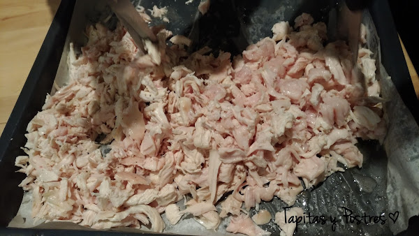 Cuando las pechugas estén hechas, las desmenuzamos con un tenedor, que nos queden trozos o hebras.