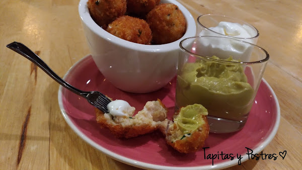 Os enseñé entonces la primera de las tres recetas que hicimos, unas pechugas rellenas de jamón y queso que estaban divinas. Pues hoy os traigo la segunda de las recetas, unas bolitas de pollo y queso ideales para picar, con dos salsas sencillas que le van como anillo al dedo.