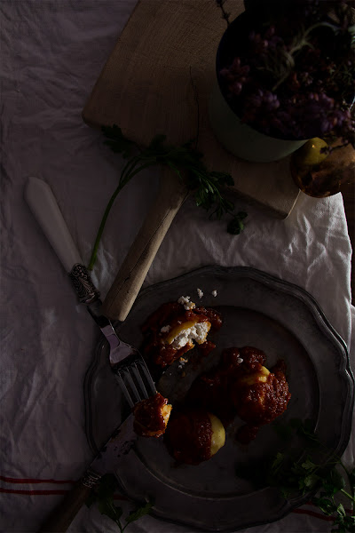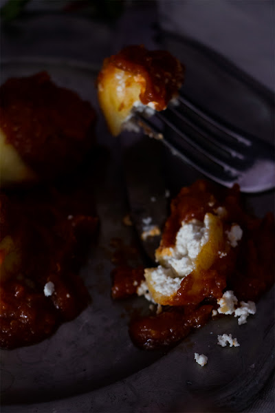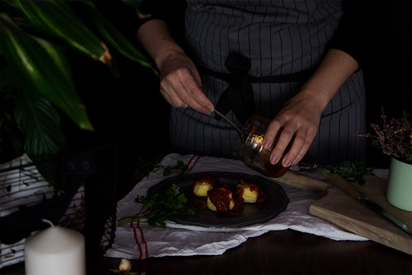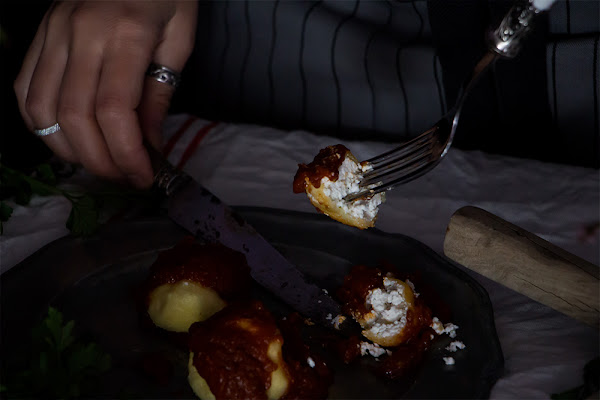 La receta original la vi el sábado a la mañana en el programa de La 2 que suelen echar del chef Jamie Oliver tan fácil que sin tan siquiera apuntar nada he sido capaz de reproducir sin problemas, nombres técnicos aparte claro. La diferencia es, que el usó una salsa a base de mantequilla y salvia. Yo sinceramente no soy mucho de usar este producto en la cocina. Hasta la bechamel de las croquetas la hago con aceite de oliva. Por lo que he sustituido este acompañamiento por una salsa de tomate, también muy italiana.