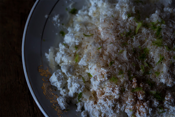 La base es un queso llamado ricota, no siempre se encuentra en el mercado, así que puedes sustituirlo por requesón, la versión castellana de este producto. Desmigamos bien y rallamos el parmesano o en su defecto un queso curado fuerte. En mi caso, un queso de oveja curado en aceite que suelo tener y que está que se sale. La ralladura, la sal y la nuez moscada, esto un poco a ojo y gusto. Mezclamos bien y probamos el punto de ingredientes para añadir más si hace falta.