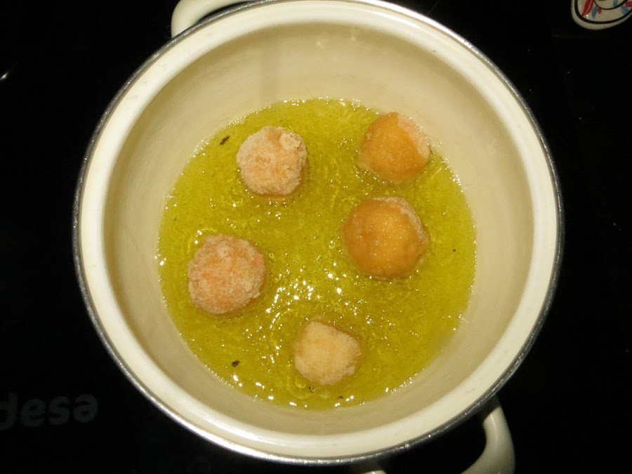 Ponéis aceite de oliva en la sartén y cuando esté caliente vais friendo las bolas, las sacáis a un papel absorbente y ya están listas para servir. Las podéis servir con la salsa que más os guste.