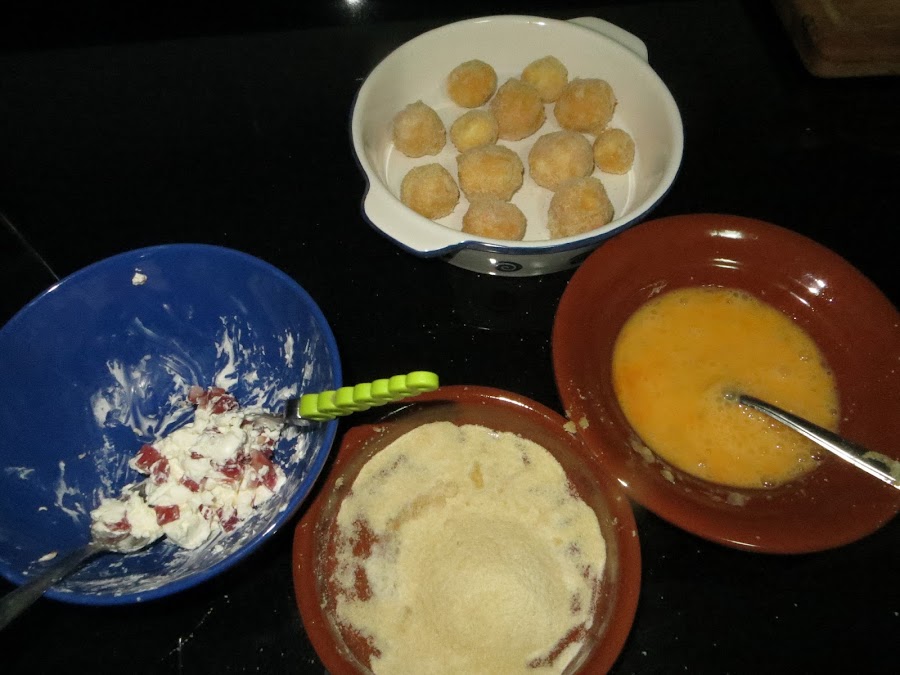 Hacéis bolitas con el queso y los ingredientes, las rebozáis en huevo y pan rallado. Recomiendo que hagáis un doble rebozado, aunque con uno simple aguantan perfectamente. Metéis 30 minutos en el congelador para que se endurezca un poco.