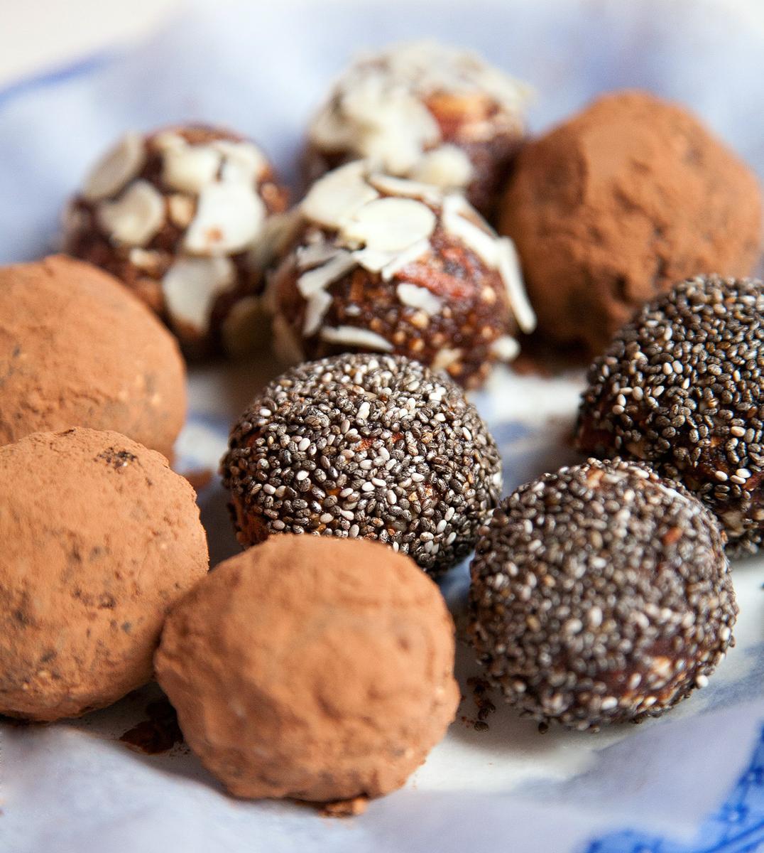 Cuando tenemos todas las bolitas las pasamos por cacao en polvo, semillas de chía o almendras o coco lo que prefiramos.
