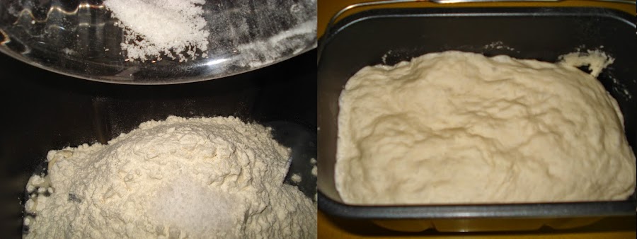 Primero haremos la masa de pan y para ello ponemos en un bol la harina con la sal y poco a poco vamos añadiendo el agua a la vez que vamos amasando. Cuando esté bien amasado añadiremos la levadura y terminaremos de amasar. Tapamos con un paño húmedo y dejamos reposar media hora en un lugar templado. Si tenemos panificadora o un robot de estos que amasan, este paso se puede hacer con él.