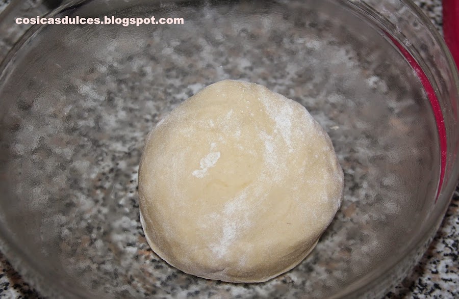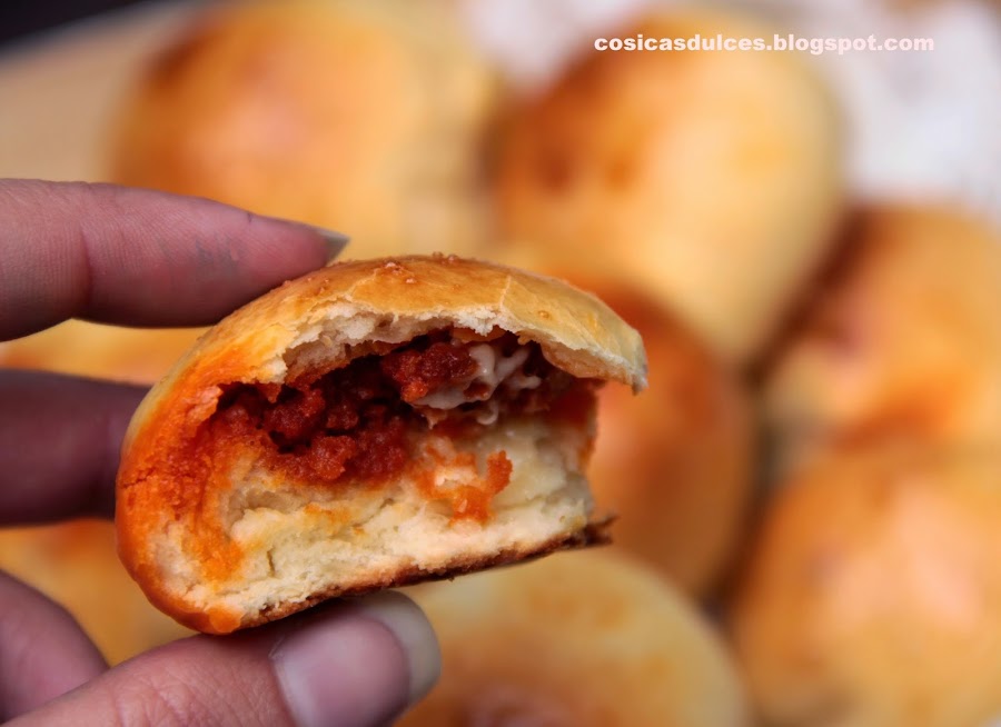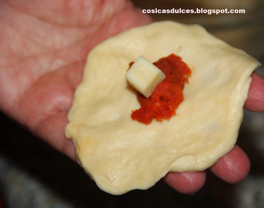 Una vez que ha levado vamos tomando porciones. Las aplanamos sobre nuestra mano y colocamos un poco de sobrasada y un cuadradito de queso. Cerramos bien formando un bollito.