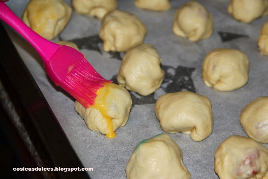 Pincelamos los bollos con huevo batido y horneamos a 180º (con horno precalentado) hasta que estén dorados.