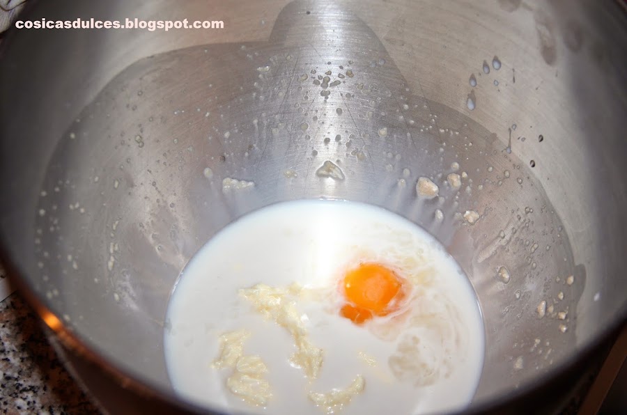Colocamos en un bol la leche tibia y sobre ella deshacemos la levadura. Incorporamos el huevo y la mantequilla y mezclamos bien ayudándonos de las varillas.
