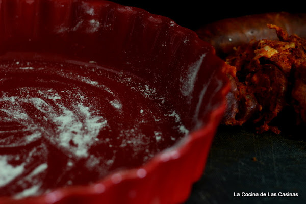 Quita la piel del chorizo y corta en trocitos, sin cuidado, desmiga sin más. Divide la masa en más o menos 24 uds. Yo lo hago a ojo, así que voy cogiendo trocitos de masa, extiendo en un cuadrado sobre la palma izquierda de la mano y relleno en el centro con el chorizo.