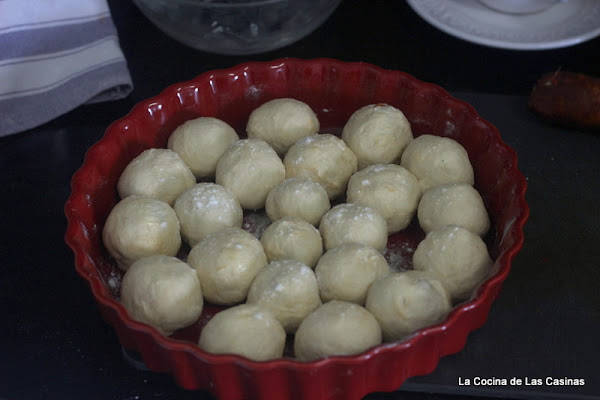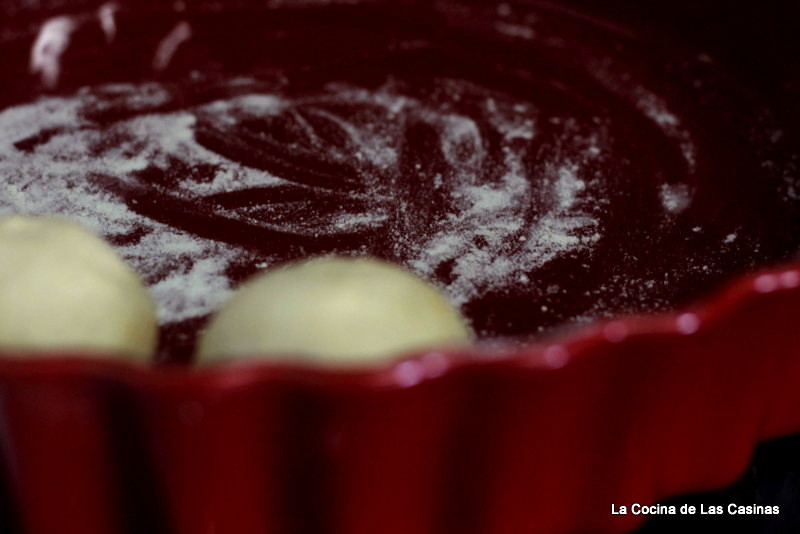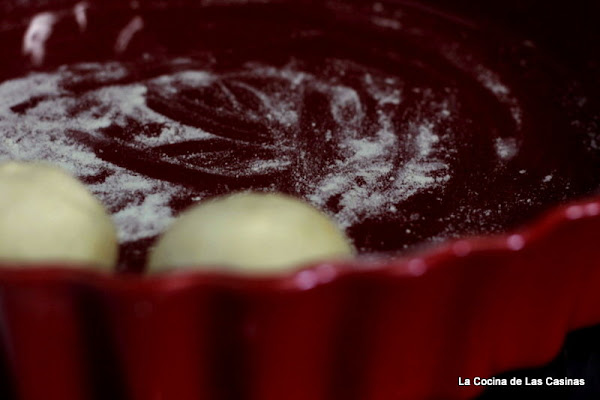 Acerca cada una de las esquinas de la masa hacia el centro, únelas y con las dos palmas forma una bola, sellando bien la masa para que no se abra. Incorpora cada una de ellas en el molde que has espolvoreado con un poco de harina, debes dejar un poco de separación ya que la masa va a seguir subiendo. Si utilizas otro molde no cerámico o simplemente la bandeja del horno, cúbrela con papel vegetal.