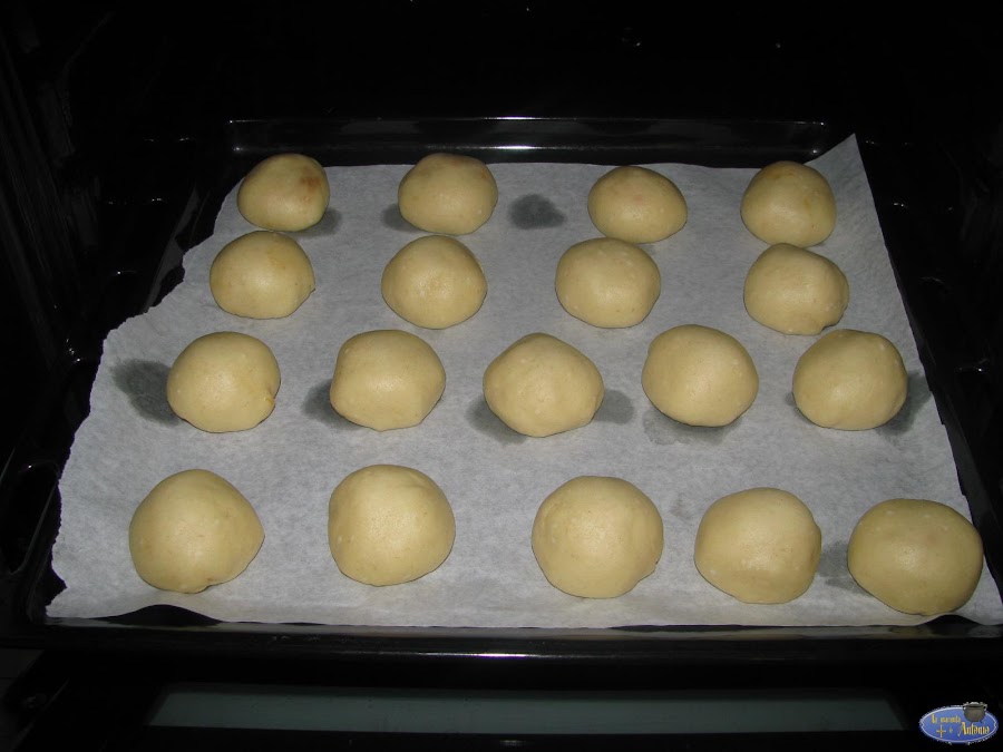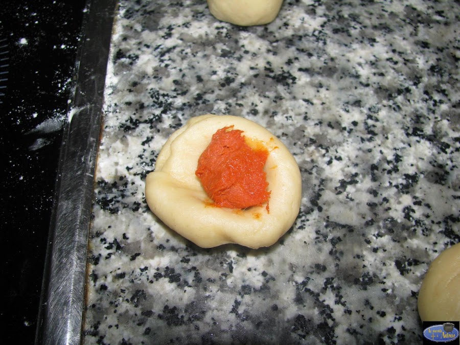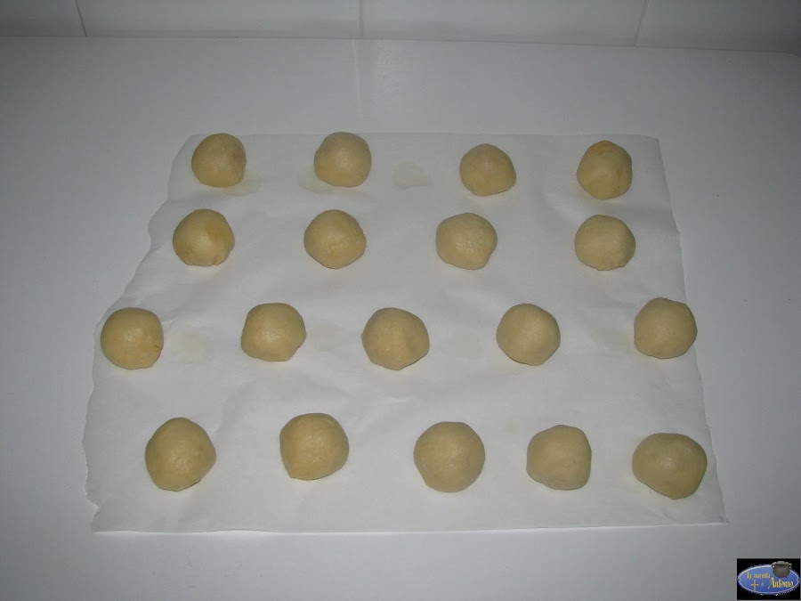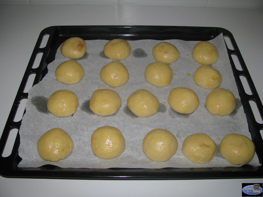 Formamos pequeñas bolas,más o menos del mismo tamaño y le ponemos dentro un poco de sobrasada o chorizo.Y las colocamos en papel de horno.