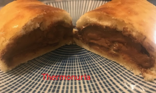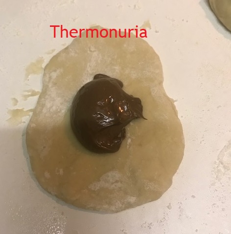 Estira cada bola con el rodillo de cocina y haz una circunferencia y pon en el centro una cucharada grande de crema de chocolate. Dobla los bordes y enrolla por los lados para que no se salga el relleno, haz los 6 bollitos.