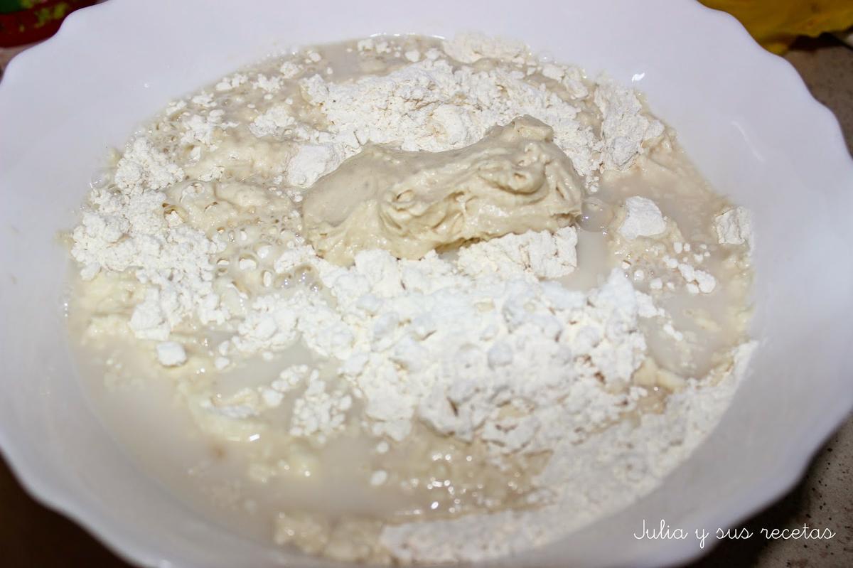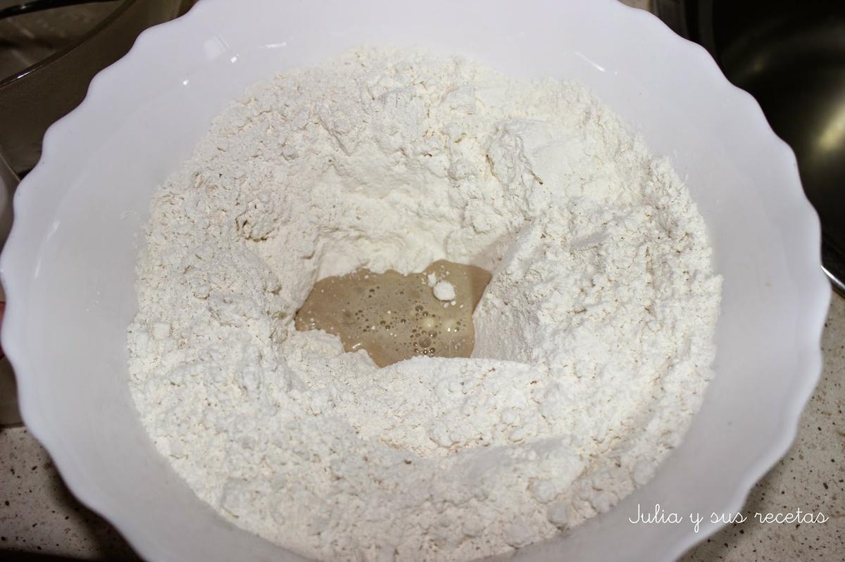 En otro cuenco mayor ponemos la harina y la sal, las mezclamos bien, hacemos un hueco en el centro y echamos la mezcla de levadura, leche y azúcar.