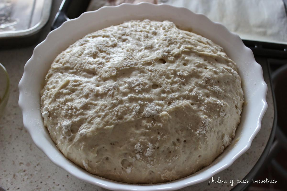 La ponemos en un recipiente untado con aceite, la espolvoreamos con harina y la tapamos con film transparente y un paño de algodón, la dejamos reposar hasta que doble su volumen (2 horas mas o menos) en un sitio cálido. Y suelo meterla en el microondas apagado, no se por qué , pero leva de maravilla.
