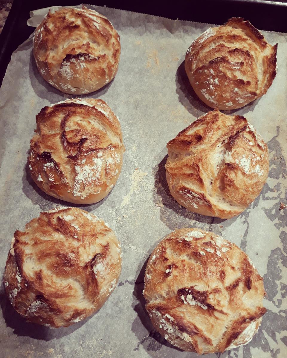 Cuando queden unos 20 minutos para que acabe el levado, vamos precalentando el horno a 235° sólo por abajo. Además, introducimos una bandeja en el “suelo” del horno. Cuando nuestros bollos hayan doblado su volumen, los iremos colocando sobre la bandeja (donde habremos puesto papel de horno) con el cierre para arriba. Espolvoreamos un poco de harina por encima y ya estarán listos para hornear. Por otro lado, pondremos un vaso de agua a hervir y, justo cuando vayamos a meter el pan en el horno, la vertemos en la bandeja de abajo. De esta manera, crearemos vapor y nuestro pan tendrá una mejor corteza. Horneamos durante 10 minutos con calor sólo por abajo, después, 20 minutos más con calor arriba-abajo.