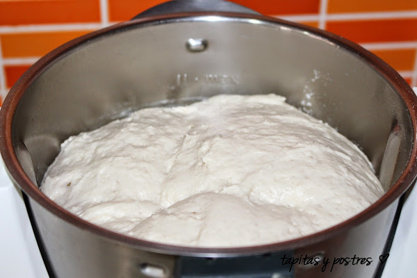 Veinte minutos después la masa ya ha crecido. La sacamos y la amasamos un poco.