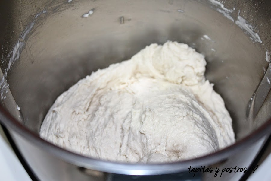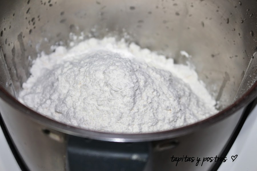 Añadimos la harina y la sal y amasamos dos minutos a velocidad espiga.