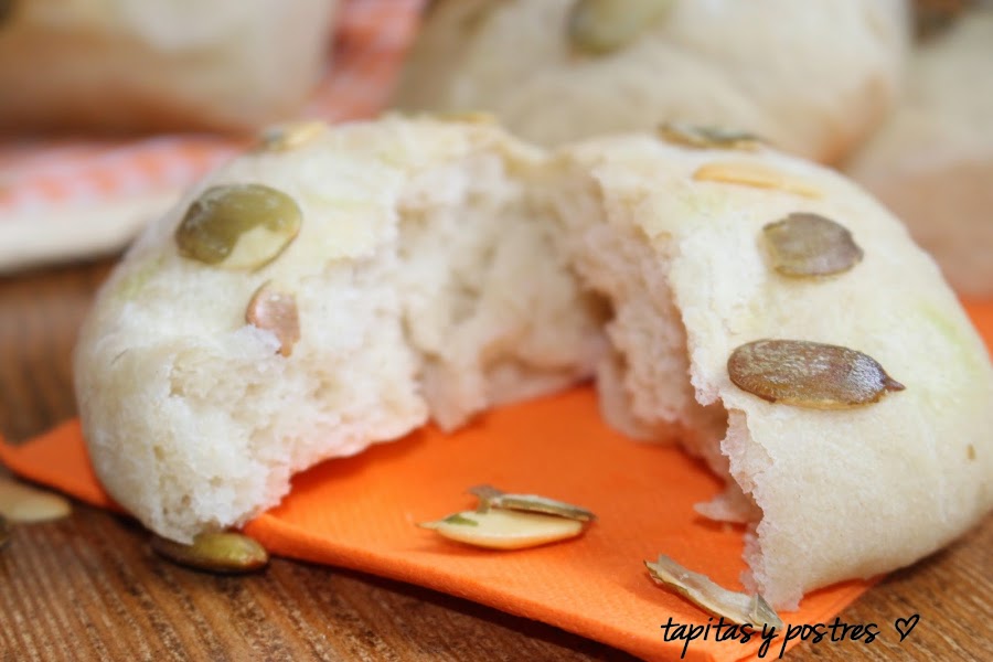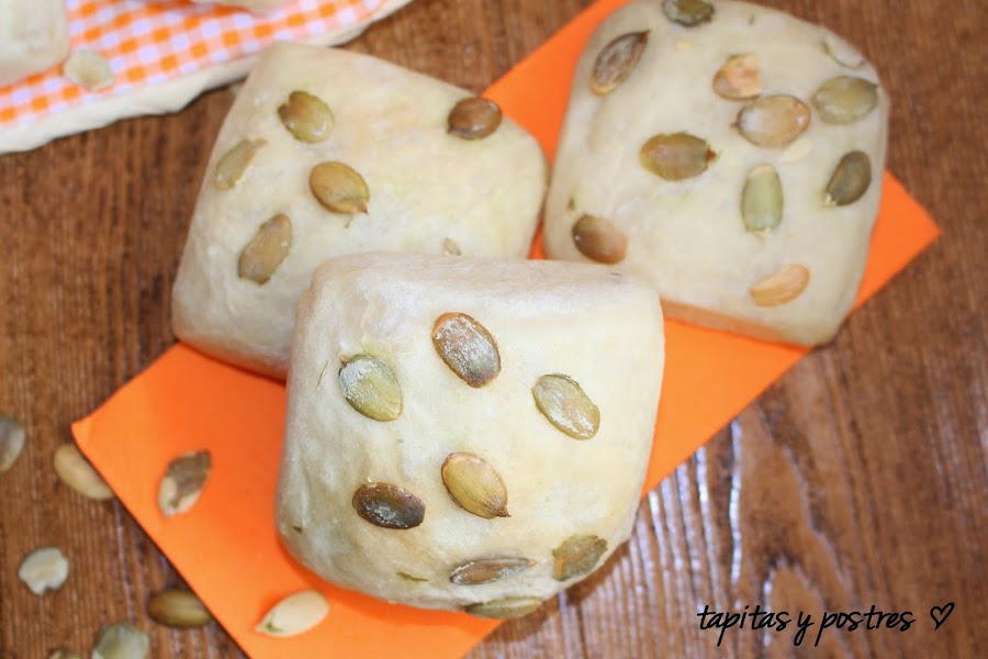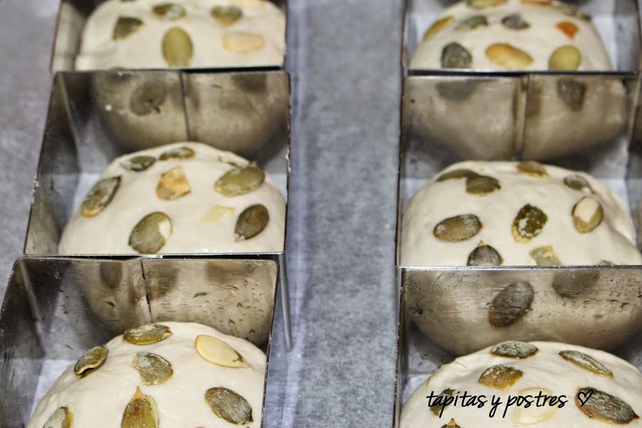 Los colocamos sobre una bandeja de horno con papel vegetal y le ponemos por encima las pipas de calabaza. Los dejamos levar dentro del horno. Una horita.