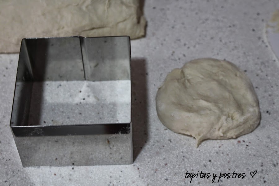 Sacamos, amasamos un poco y hacemos un rulo largo. Cortamos porciones más o menos iguales y hacemos los bollitos. Yo en esta ocasión he usado un aro cuadrado de emplatar para darles la misma forma que los de mercadona. Si usais un aro, pincelarlo de aceite por dentro.