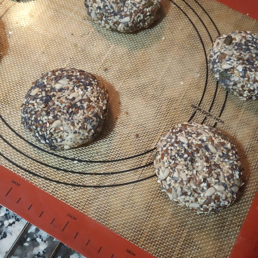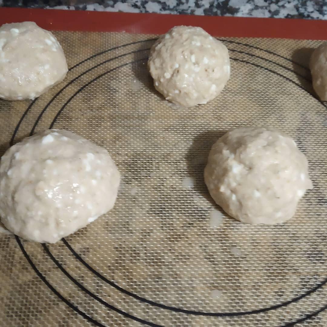 Remover bien. Con las manos mojadas formar los bollos, cubrir con las semillas.