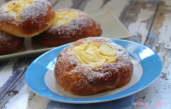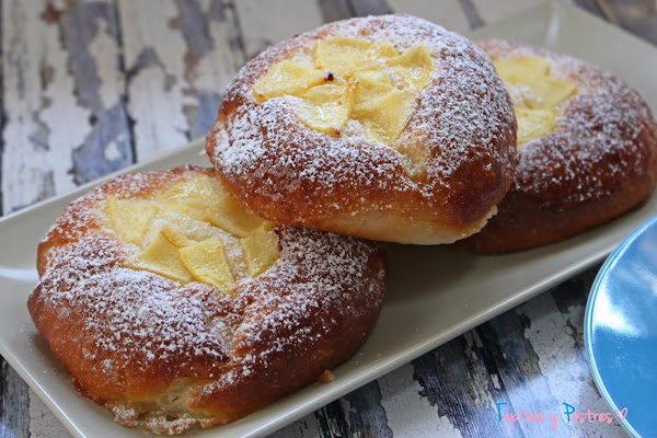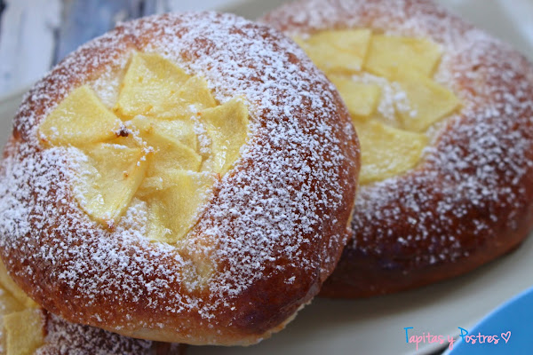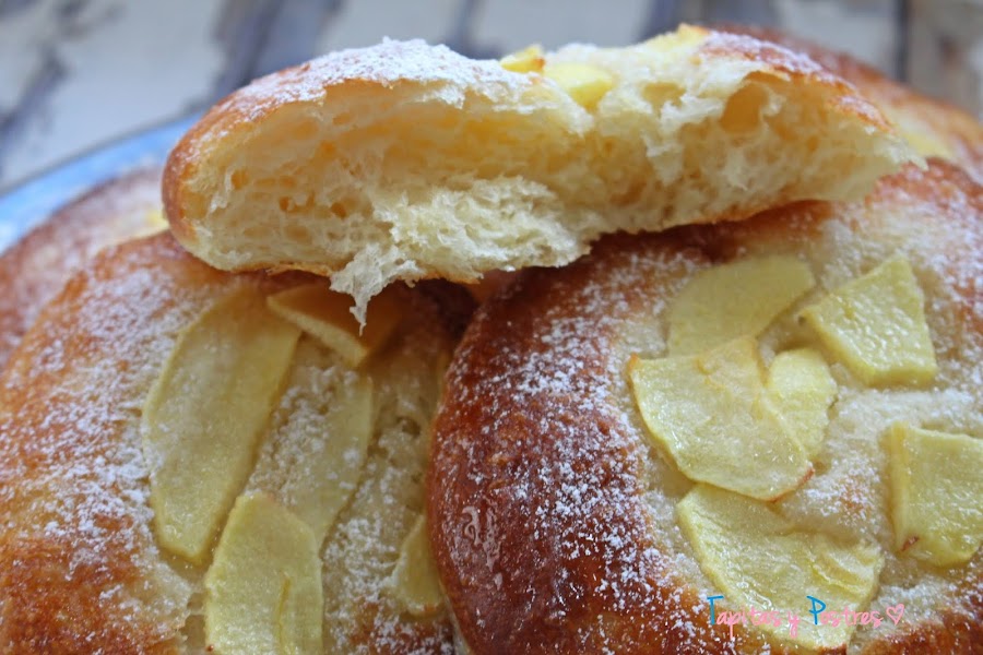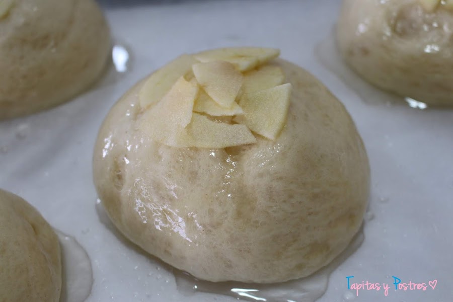 Dejamos que reposen en un lugar templado, y una vez hayan doblado su volumen (una hora más o menos según la temperatura exterior) pintamos con el almíbar frío y ponemos unas láminas de manzana encima. Espolvoreamos con un poquito de azúcar encima.