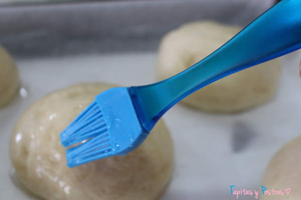 Cuando los bollitos hayan levado los pintamos con suavidad, sin apretar, con el almíbar frío.
