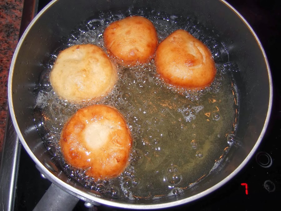 Mientras tanto vamos poniendo el aceite en una sartén o cazo y lo calentamos. Una vez que la masa está lista se va echando en el aceite bien caliente se le deja un par de minutos por cada lado y se sacan a una fuente en la que tendremos papel absorbente para quitarle el exceso de aceite.