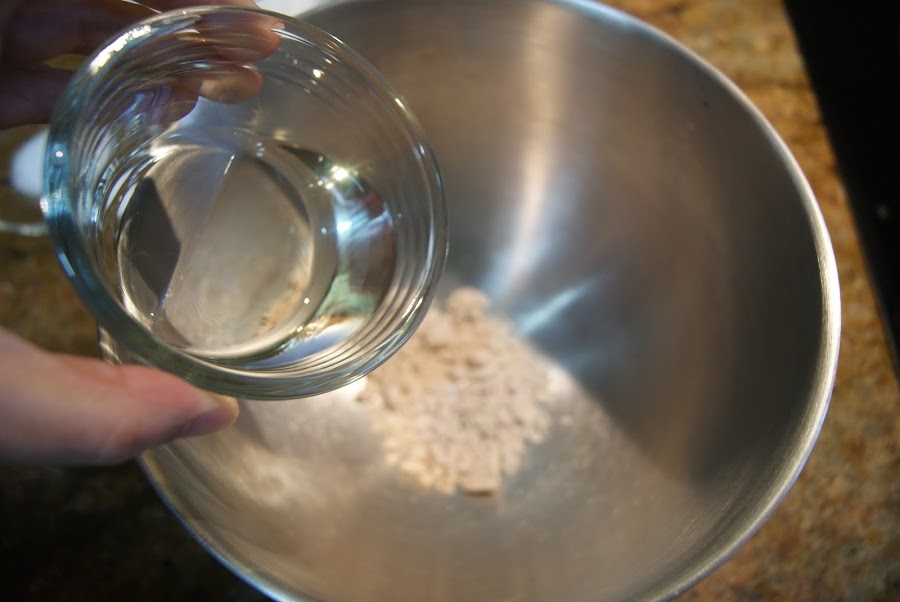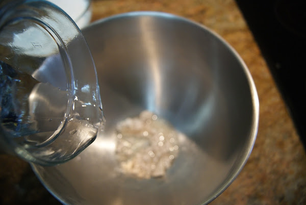 En un cuenco grande o en el recipiente de la amasadora, deshacemos con las manos la levadura fresca