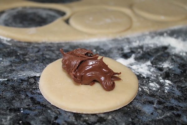 Tomamos un círculo de masa, sobre él añadimos una cucharadita de Nutella y tapamos con otro círculo de masa. Sellamos bien por los bordes para que al freír no se salga el chocolate.