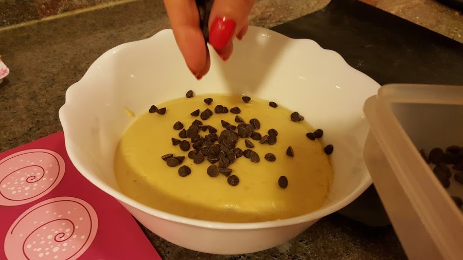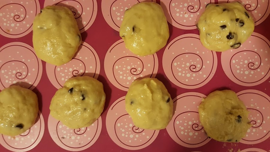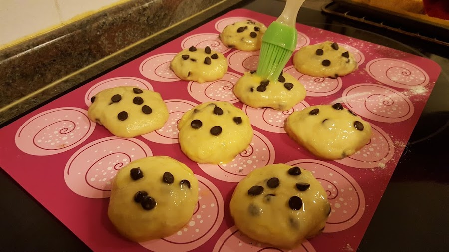 5.- Precalentamos el horno y añadimos a la masa, las gotitas de chocolate, dejando algunas para adornar. Después vamos formando bollitos.