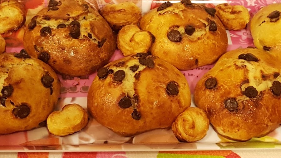 Como los bollitos de leche nos gustan tanto, esta vez los hice añadiendo gotitas de chocolate. Ya probé con las magdalenas y el resultado fue fantástico. Ahora también y al sacarlos me acordé de los doowap, tenían la misma forma y qué buenos.