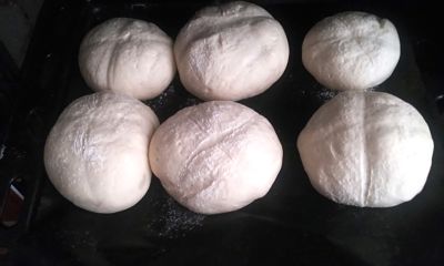 Saca la masa del vaso y haz bolitas de unos 50 gramos, ponlas en la bandeja del horno. haz unos cortes en cada bollito con un cuchillo afilado y espolvorea un poco de harina por encima de ellos.