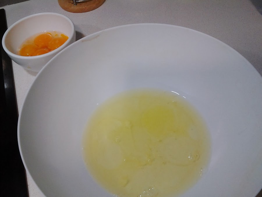 Precalentar el horno a 180º. Separamos las yemas de las claras y batimos estas últimas junto al azúcar hasta que estén a punto de nieve.