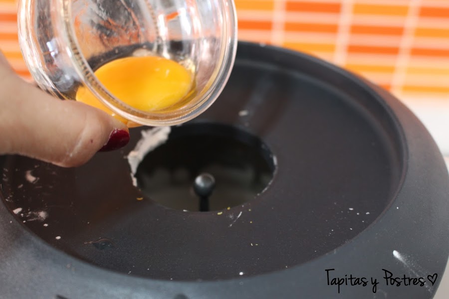 Ahora ponemos velocidad 2, sin tiempo y vamos a ir añadiendo las yemas una a una hasta que se integren bien. Tened la precaución de cuando separéis las claras de las yemas de poner cada yema en un platito individual.