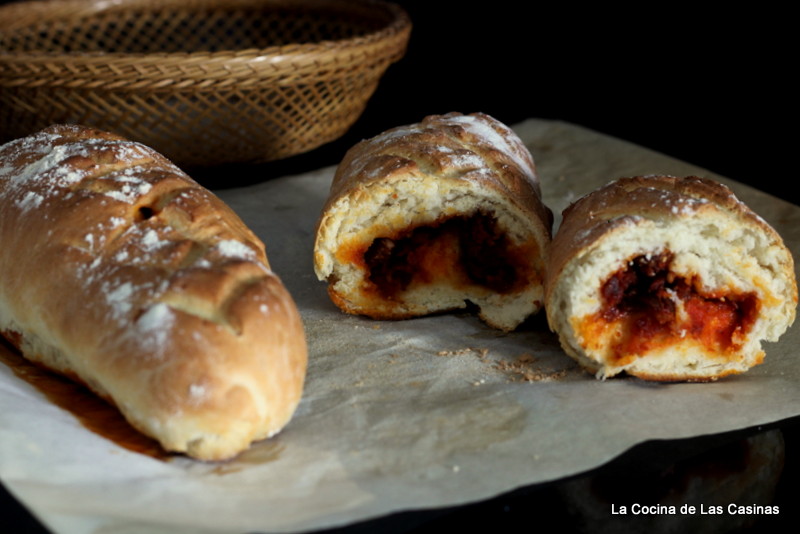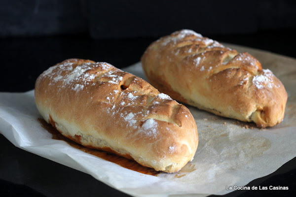 Desgasifica la masa, divide en 2 trozos más o menos iguales. Con la mano, formas un rectángulo (más o menos, no hay que molestarse demasiado). Es una masa un poco pegajosa, si es necesario, ponte un poco de aceite de girasol en las manos, rellena con un chorizo, que yo corto trasversalmente y pongo a cada lado para que empape todo el bollo al que debes de quitar la piel.
