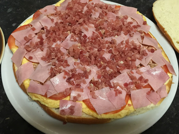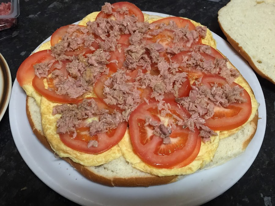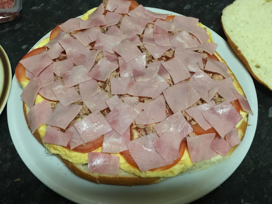 Vamos añadiendo los ingredientes por capas, yo suelo poner primero el tomate a rodajas, el atún, (en este punto si ponéis mayonesa lo pongo encima del atún), y luego ya pondría los jamones para combinar el dulce con el salado.