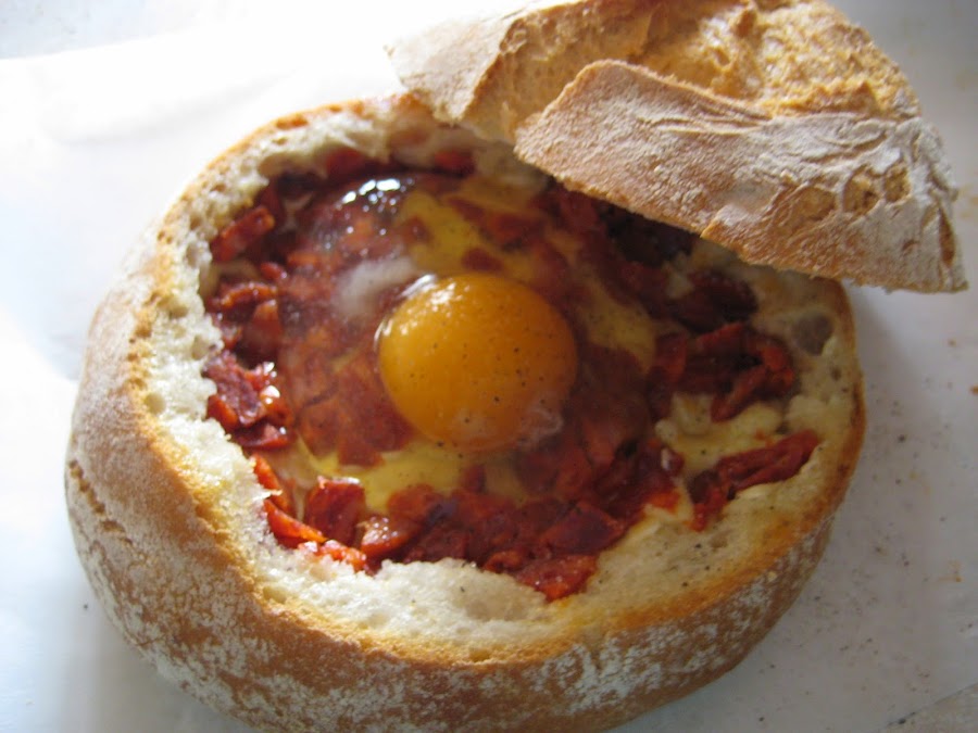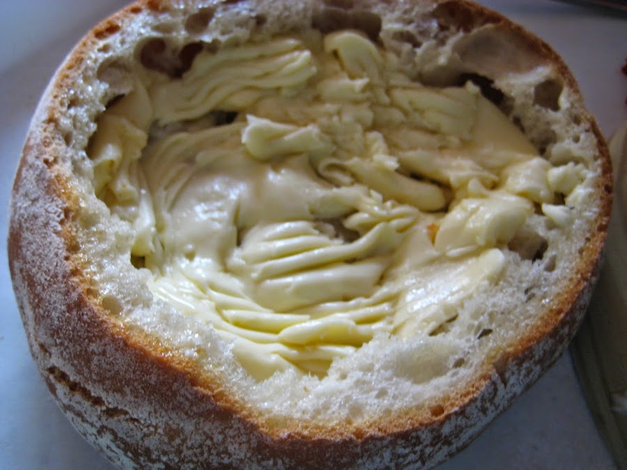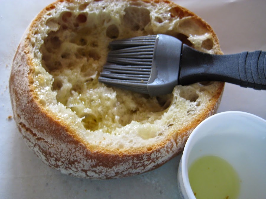 Abrir el bollo por la parte superior, quitarle la miga (para hacer hueco).