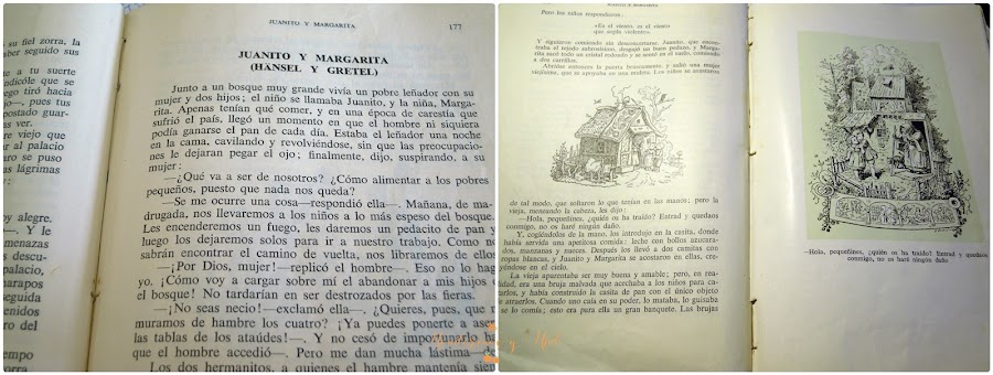 He leído casi todos los cuentos del libro, pero al cogerlo, se me abrió en la página de los hermanos Juanito y Margarita, (Hansel y Gretel en español) y me acordé de cuando la vieja de la casa de chocolate, salió y les dijo: