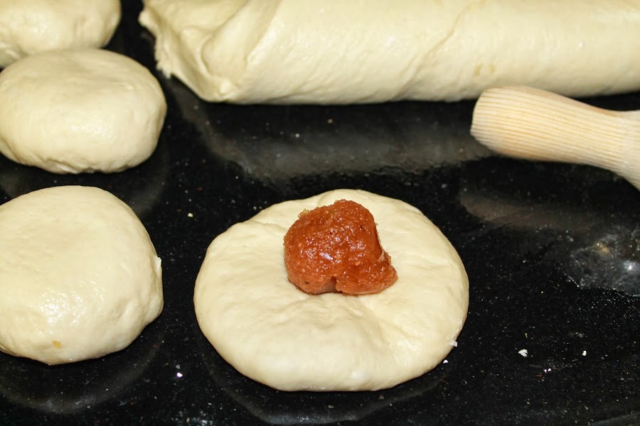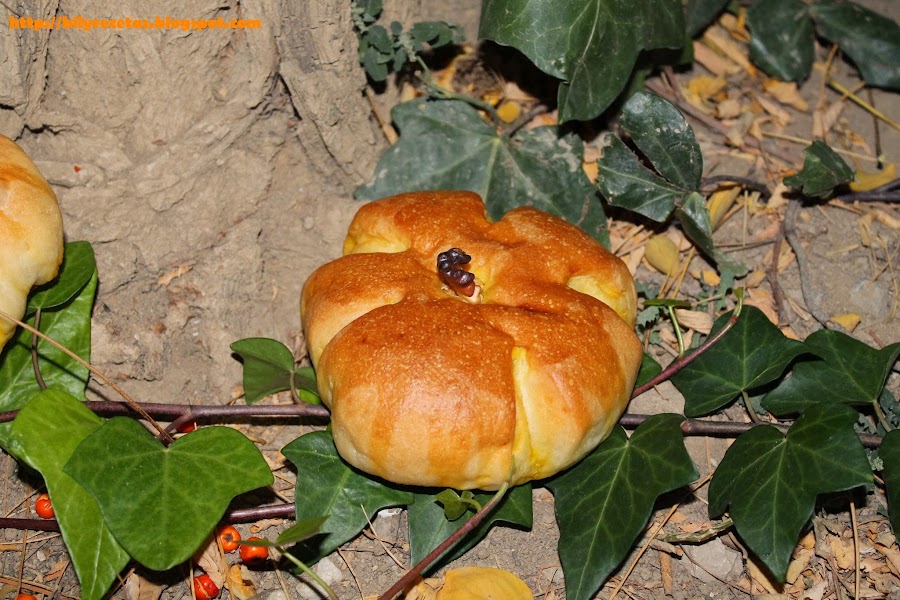Estos días la protagonista indudable es la calabaza. En casa nos hemos centrado más en la Castañada y al final no hemos hecho ni la típica calabaza luminosa como siempre. Llevo días con estos bollos en mente y pensando de que rellenarlos me decidí por el membrillo. Se nota que he entrado en el otoño profundo verdad? La verdad es que no quería desaprovechar la masa de los Huesitos de pan ya que la probé con Bollos preñaos y me encanto el resultado. En esta ocasión el relleno ha sido dulce pero podéis improvisar con lo que más os gusta. La única diferencia es que he cambiado el aceite de oliva por mantequilla en pomada pero no he visto gran diferencia. Para pintar las ¨calabacitas¨ hice una mezcla de leche, colorante amarillo y miel y con esto pincele antes de hornear. Tenéis la receta aquí.